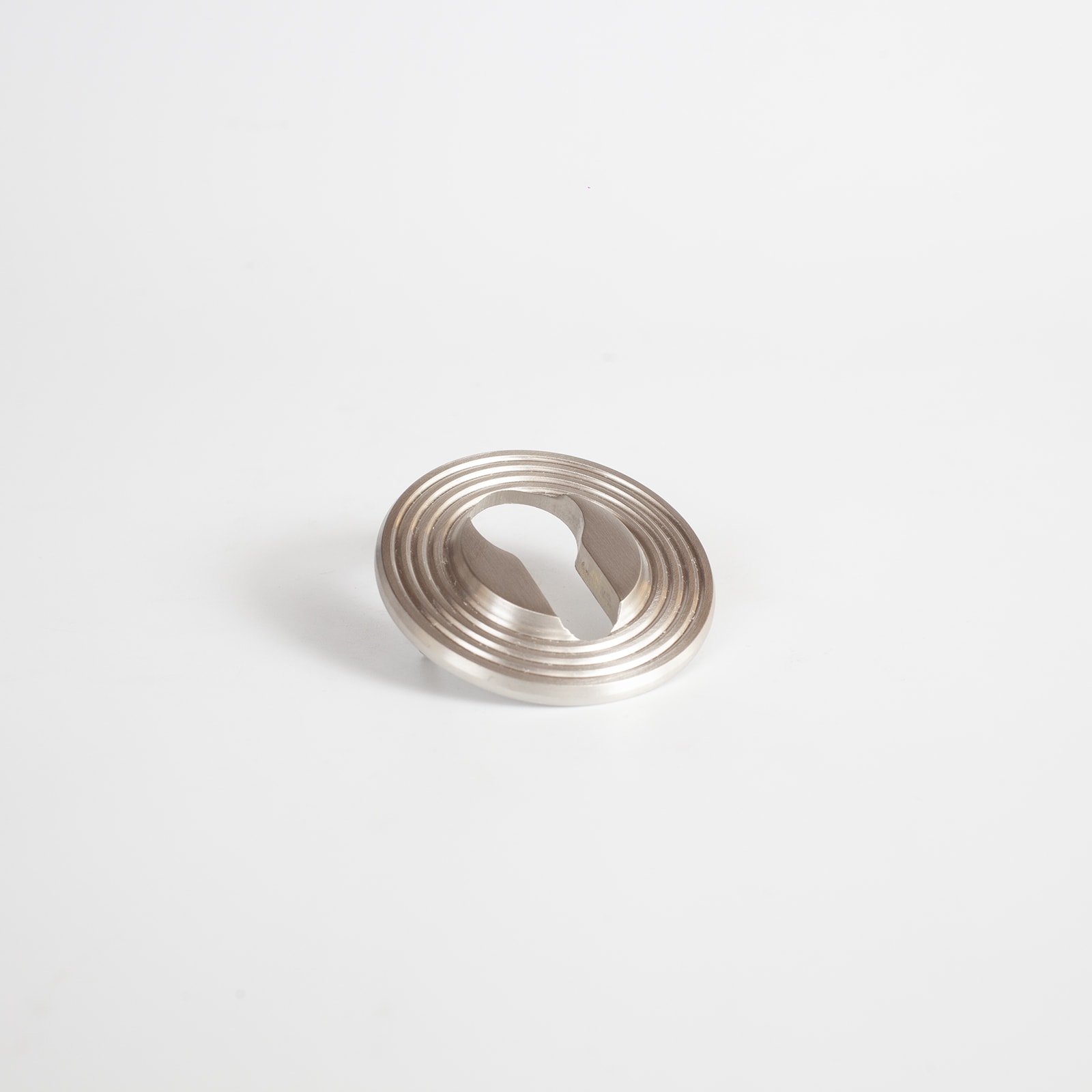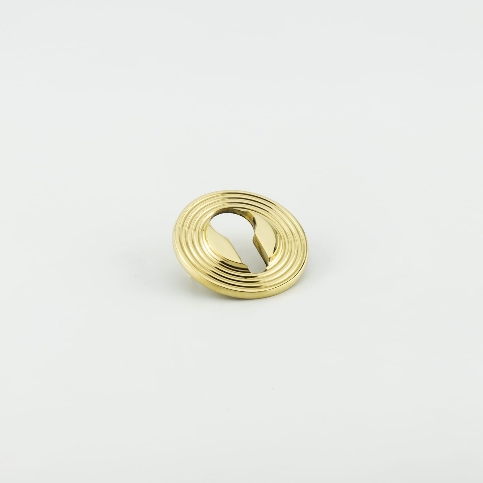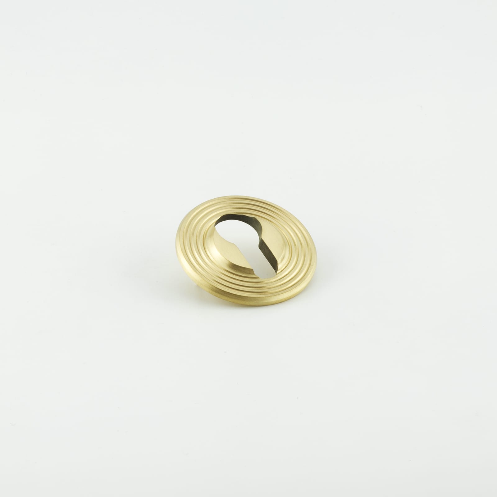 Description Euro escutcheon with a large stepped edge with reeded detail, Pin fixed, Solid brass material