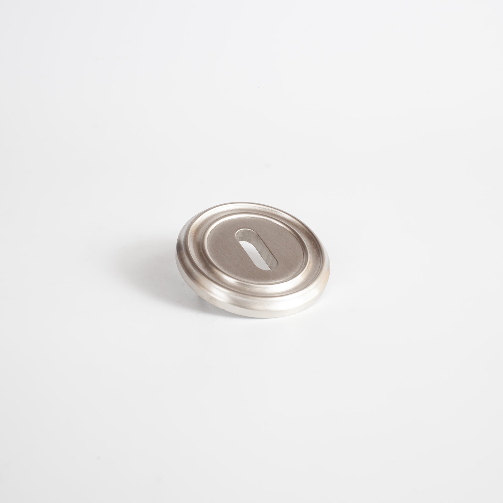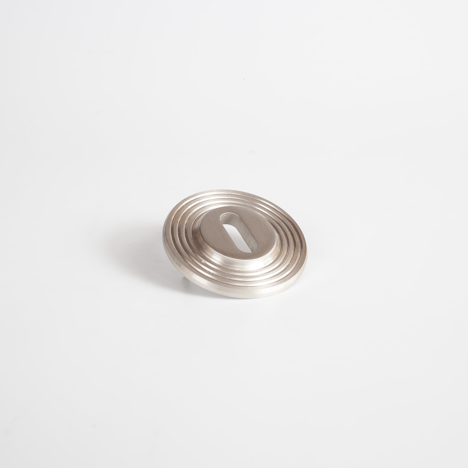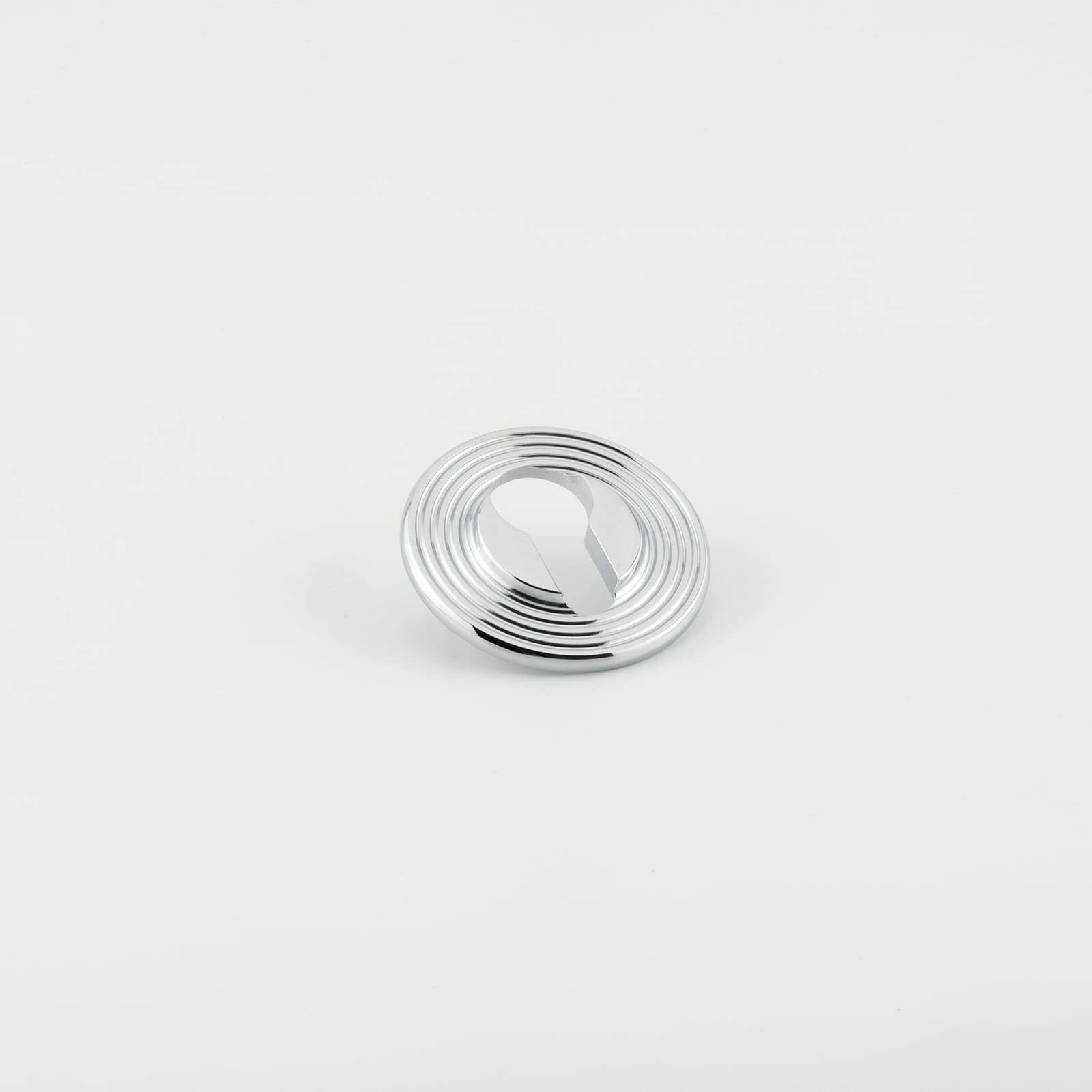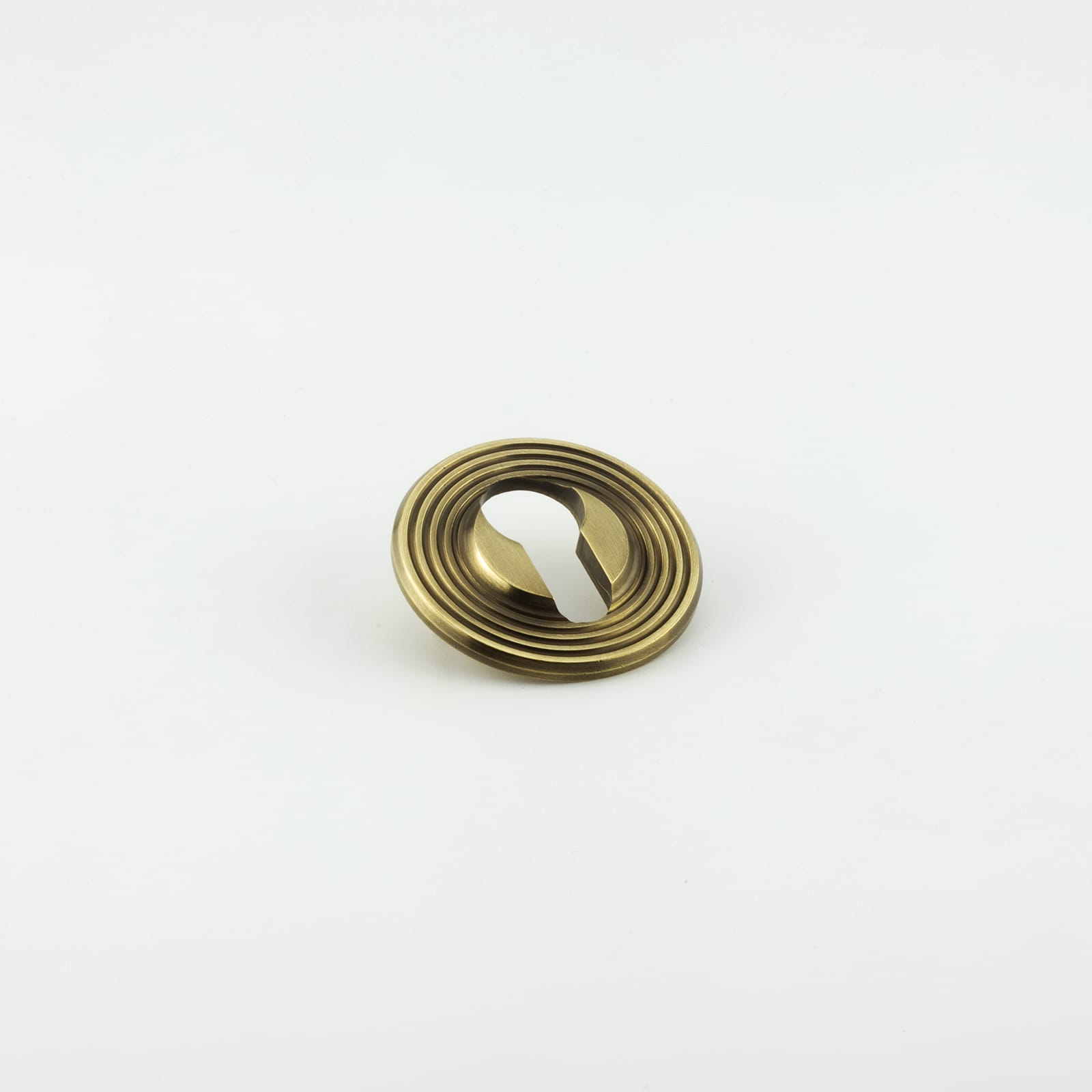 Description Euro escutcheon with a large stepped edge with reeded detail, Pin fixed, Solid brass material