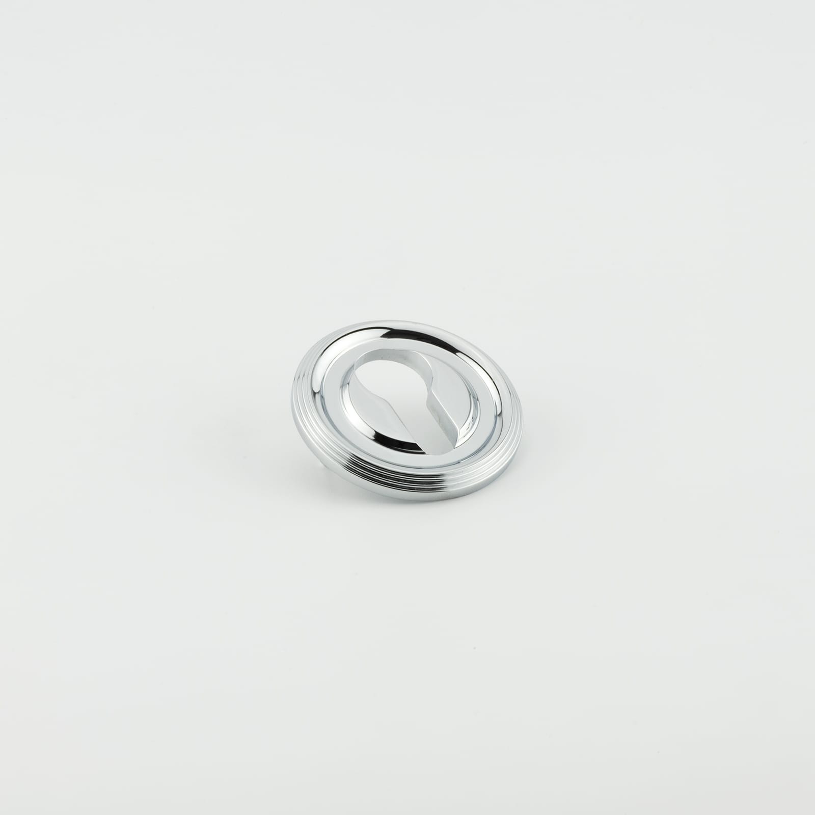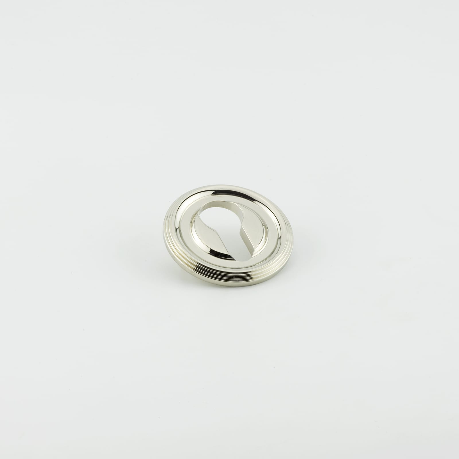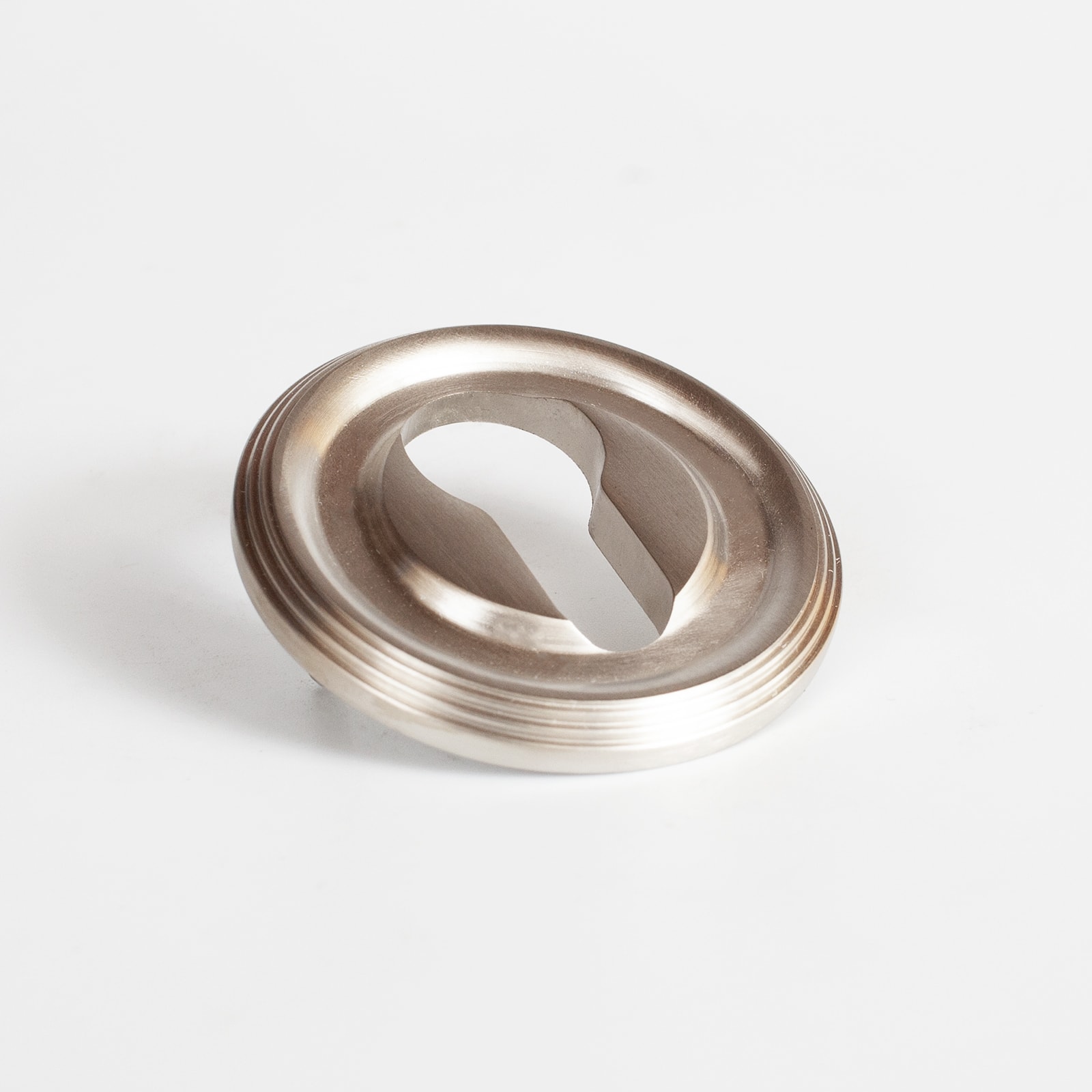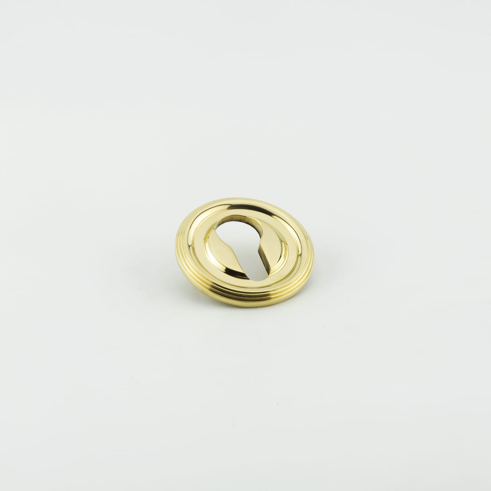 Description Euro escutcheon with 4 stepped edge, Large concave face and curved lip detail, Pin fixed, Solid brass material