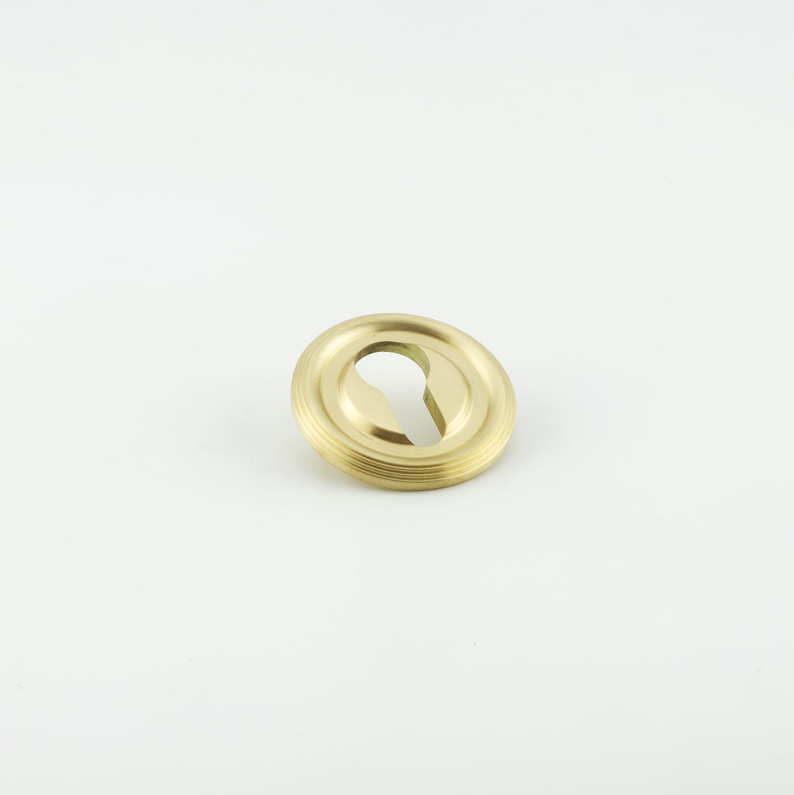 Description Euro escutcheon with 4 stepped edge, Large concave face and curved lip detail, Pin fixed, Solid brass material
