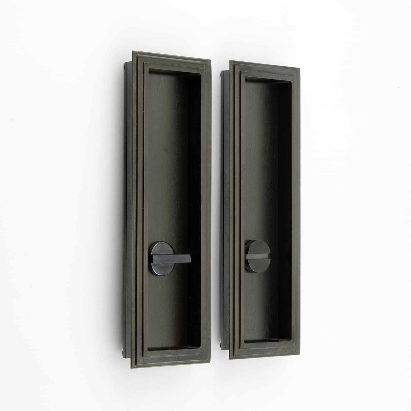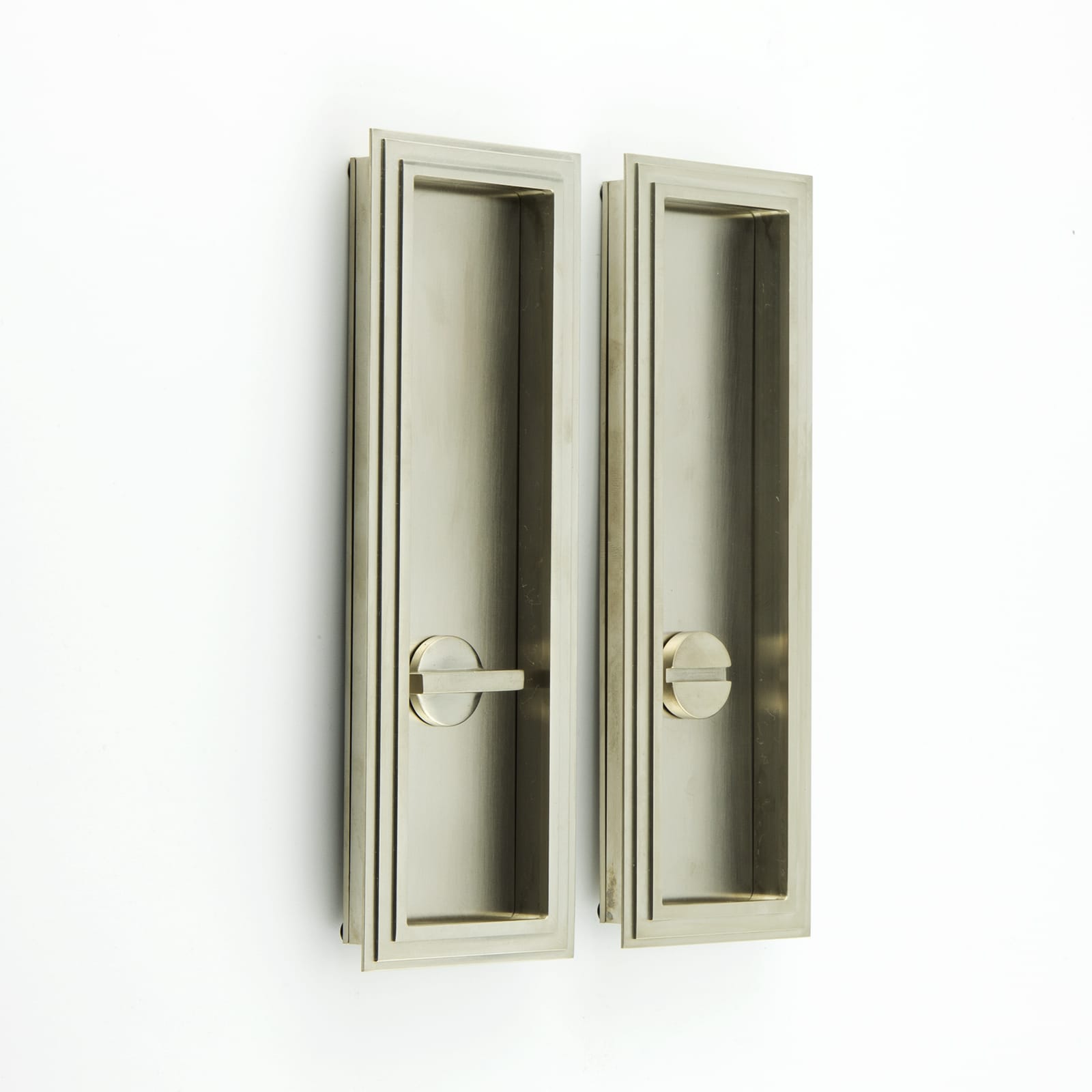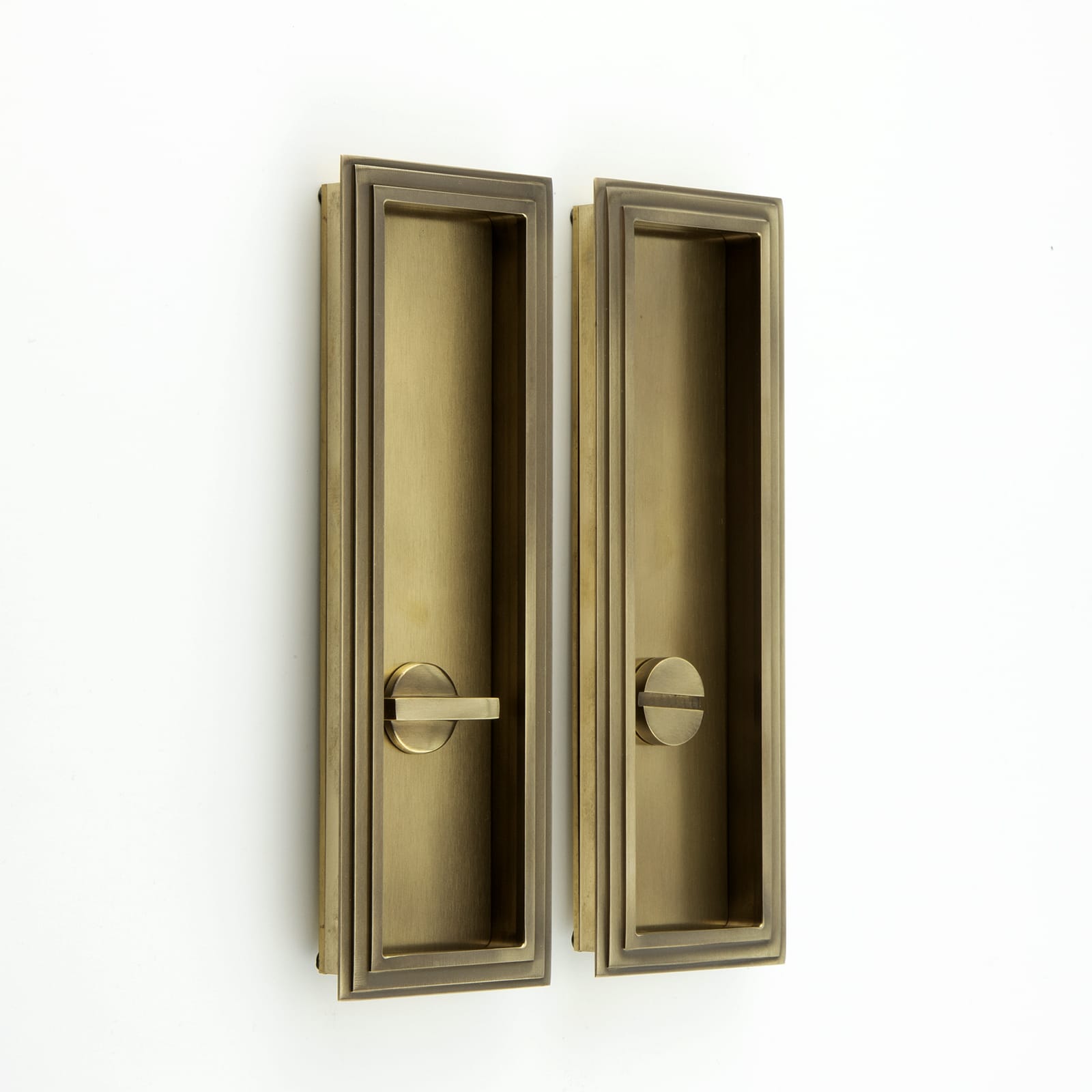 Description Stepped rectangular locking flush pull set, solid brass material, 5mm spindle