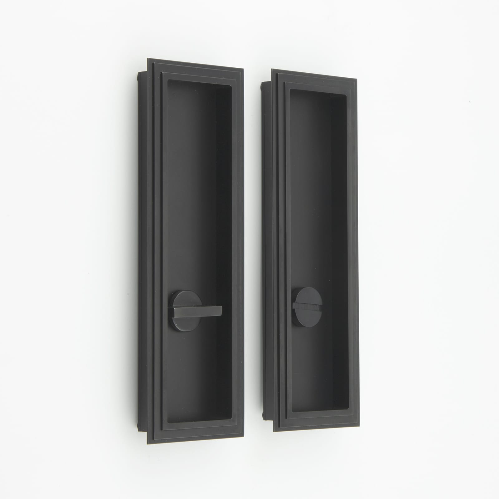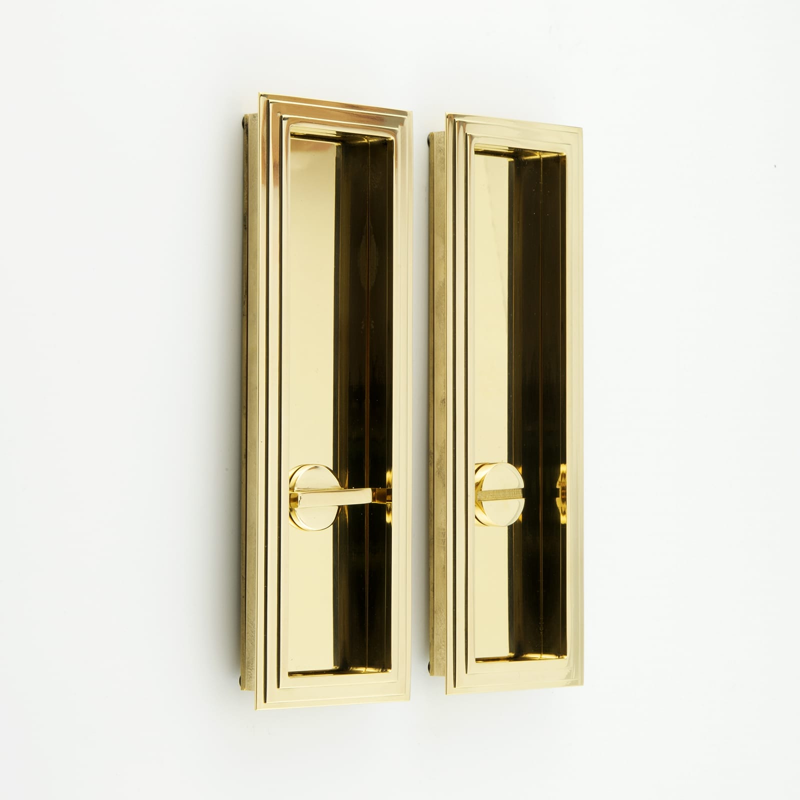 Description Stepped rectangular locking flush pull set, solid brass material, 5mm spindle